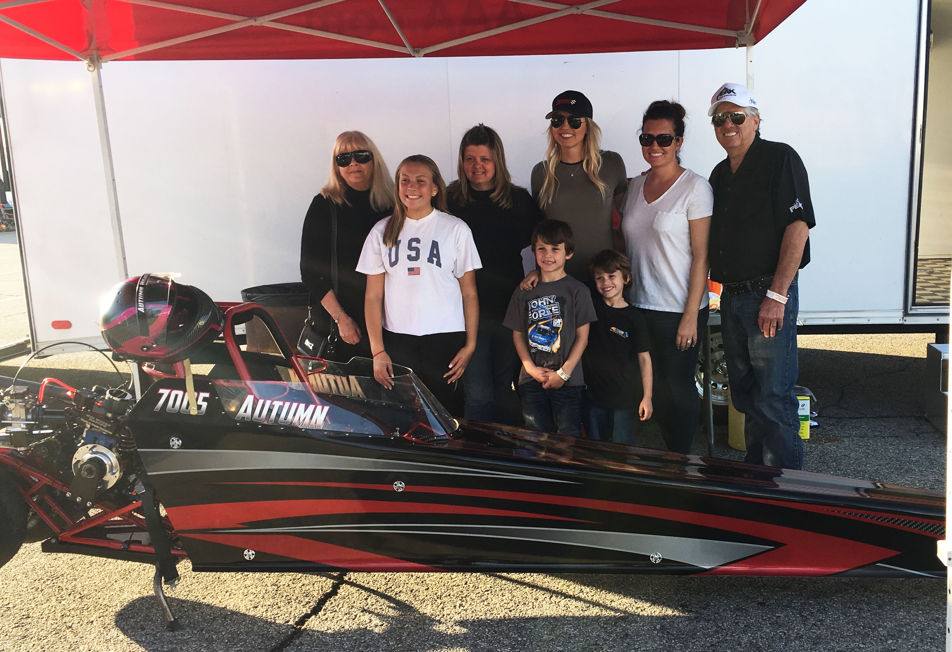 Fun time family shot at Irwindale Speedway Jr. Dragsters Race. (L-R Front, Autumn Hight, Jacob Hood, Noah Hood. L-R Back, Lana Starks, Adria Hight, Courtney Force, Ashley Force Hood and John Force)